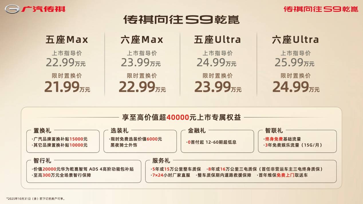 9月19日,传祺神往S9乾崑推出4款车型,价格区间为22.99-25.99万,10月31日前,可享限时1万元补助,补助后价格为21.99-24.99万。与此同时,还供给价值4万元的上市礼包。