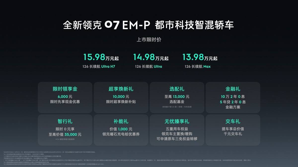 正式上市。新车共推出126长续航Max、126长续航Ultra、126长续航Ultra H7三款装备版别,上市限时值13.98万元起。一同,全新领克07 EM-P还预备了限时领享金、超享焕新礼、选配礼、金融礼、智行礼、补能礼、无忧臻享礼、交车礼在内的8重限时福利。
