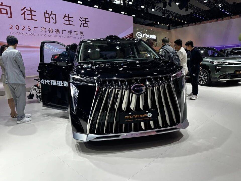广汽传祺展出了第四代M8福祉版,在一般宗师版基础上加长侧裙,选用专属“曜晶紫”车色,阳光下可呈现出紫-黑-蓝的突变作用,辨识度极高。展车仍坚持“醒狮”前脸,纵向镀铬饰条高亮电镀,与L形大灯内嵌的388颗LED灯珠构成“獠牙”式日行灯带。