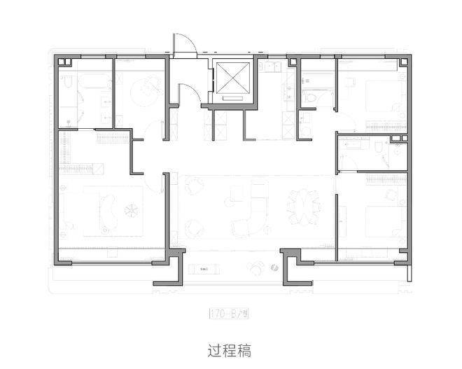 直接放大招,五面宽,南向总面宽17.2米,客厅面宽8.2米,主卧面宽5.4米,自带衣帽间、独立收纳空间。三个套房规划,把豪宅该有的爱崇感组织得明明白白。