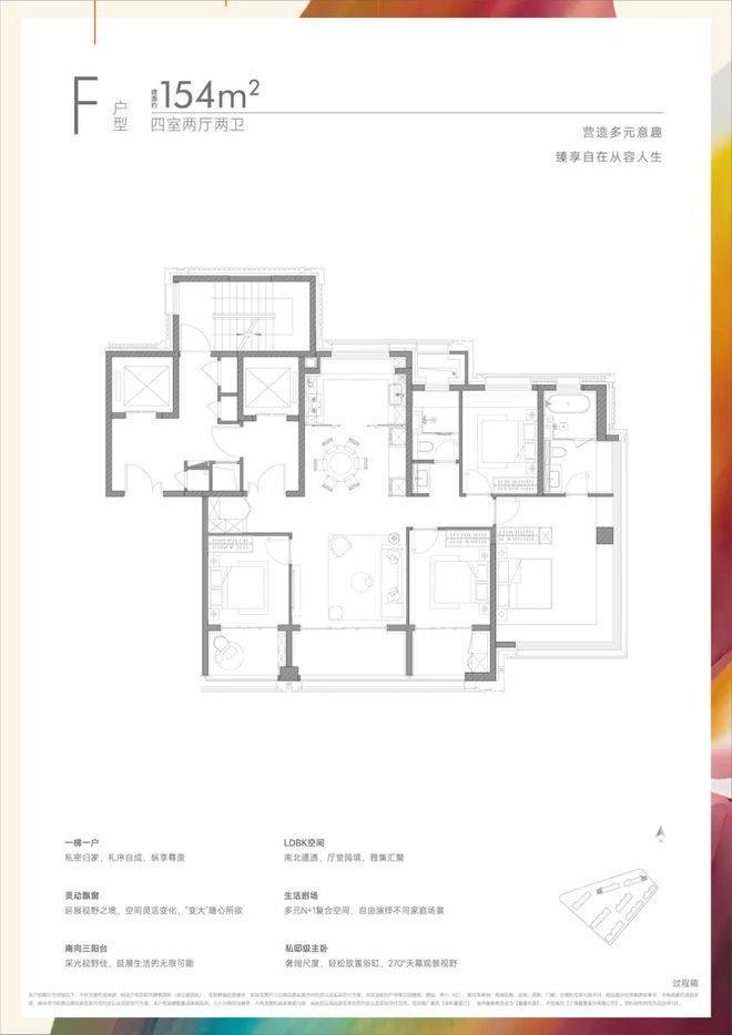 双阳台,一切户型自带入户私厅,哪怕是少数一梯两户的楼栋,也是电梯对开,也给你留出了爱崇的典礼感。
