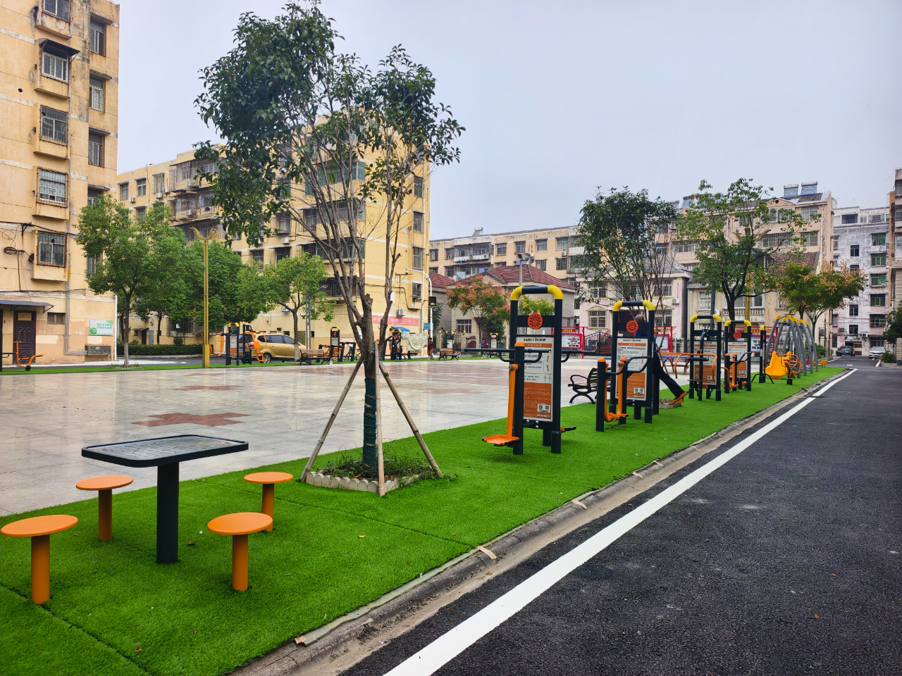 在兴隆社区花园小区健身长廊,绿色人工草坪铺满地上,踩上去松软有弹性。居民张大爷踩着散步机训练,他笑着说:“曾经健身区都是水泥地,摔着了疼,现在这草坪又软又防滑,咱们老年人训练也定心!”长廊嵌入小区广场两边,运动空间与绿植景象融为一体,居民下楼走几步就能敞开训练。